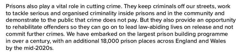 The plan continues with ideas that blatantly ignore recommendations, previous experience, the expertise of those on the ground… and even logic. More stop-and-search powers, even though these are known to disproportionately target black people. More prisons, even though their £37,000 per person per year merely results in the £18.1 billion bill for high re-offending rates, usually within 12 months of release. You just have to read the below paragraph and compare with the statistics to see how deluded and detached from reality the reasoning behind these plans are!